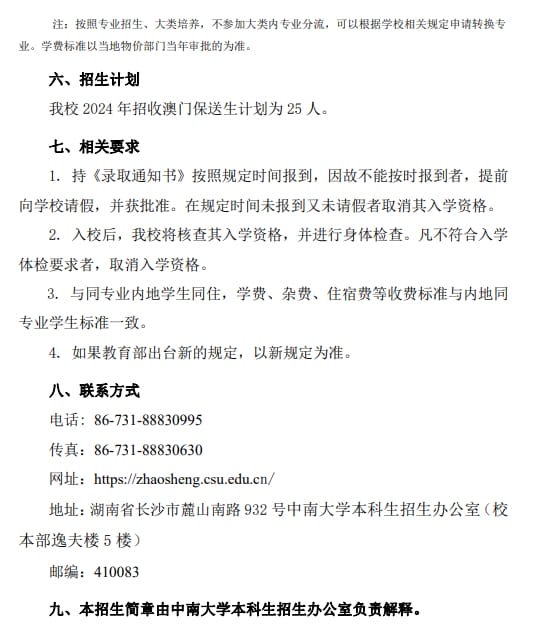 中南大学2024年澳门保送生招生简章