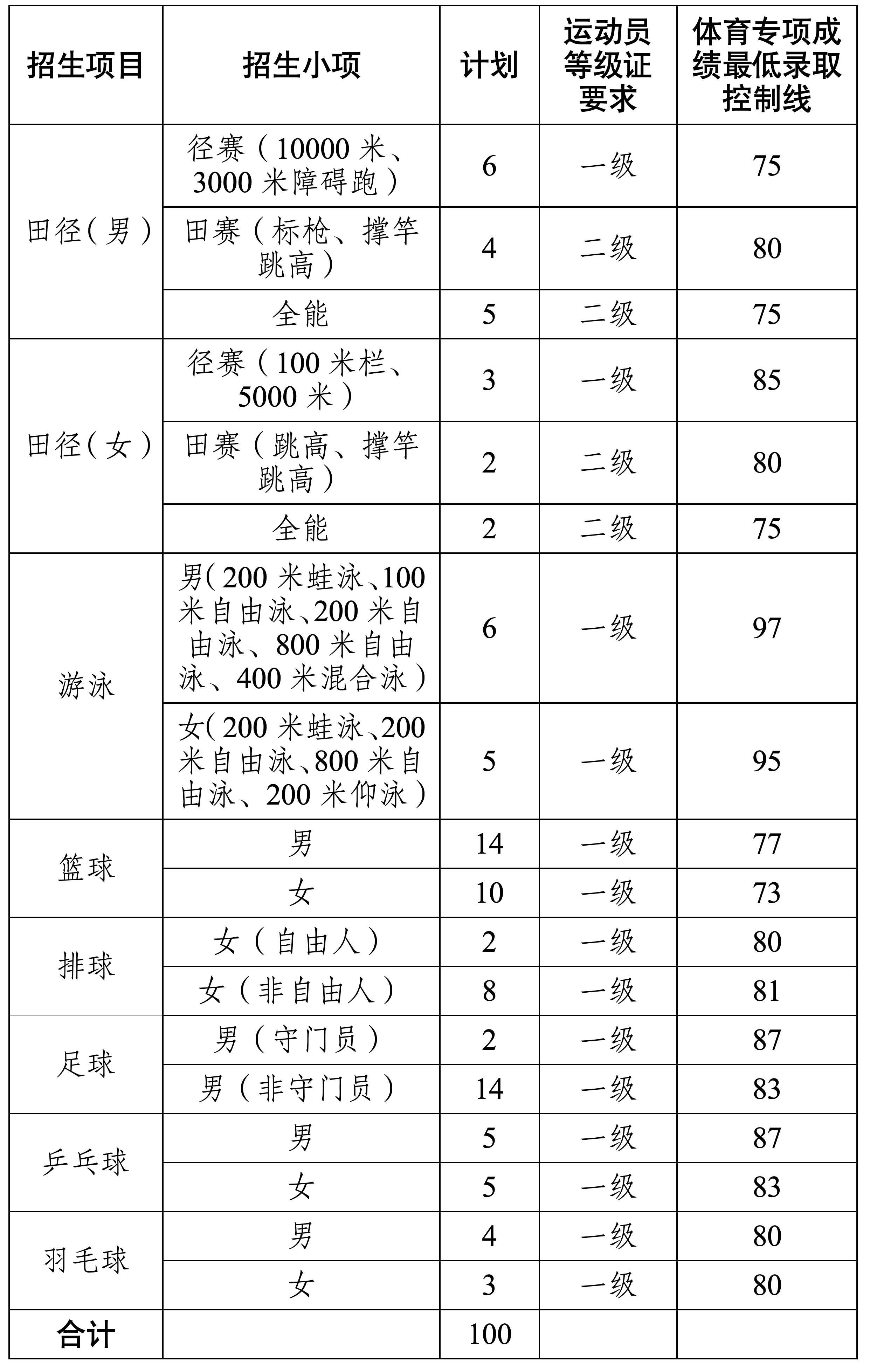 我校2026年运动训练专业招生计划≤100人(不含保送运动员),各项目招生计划如下: